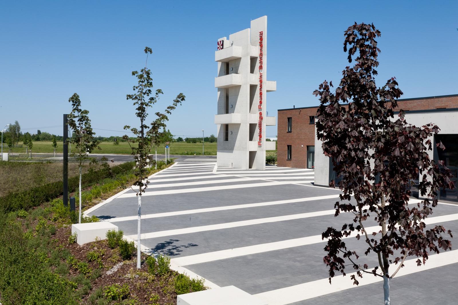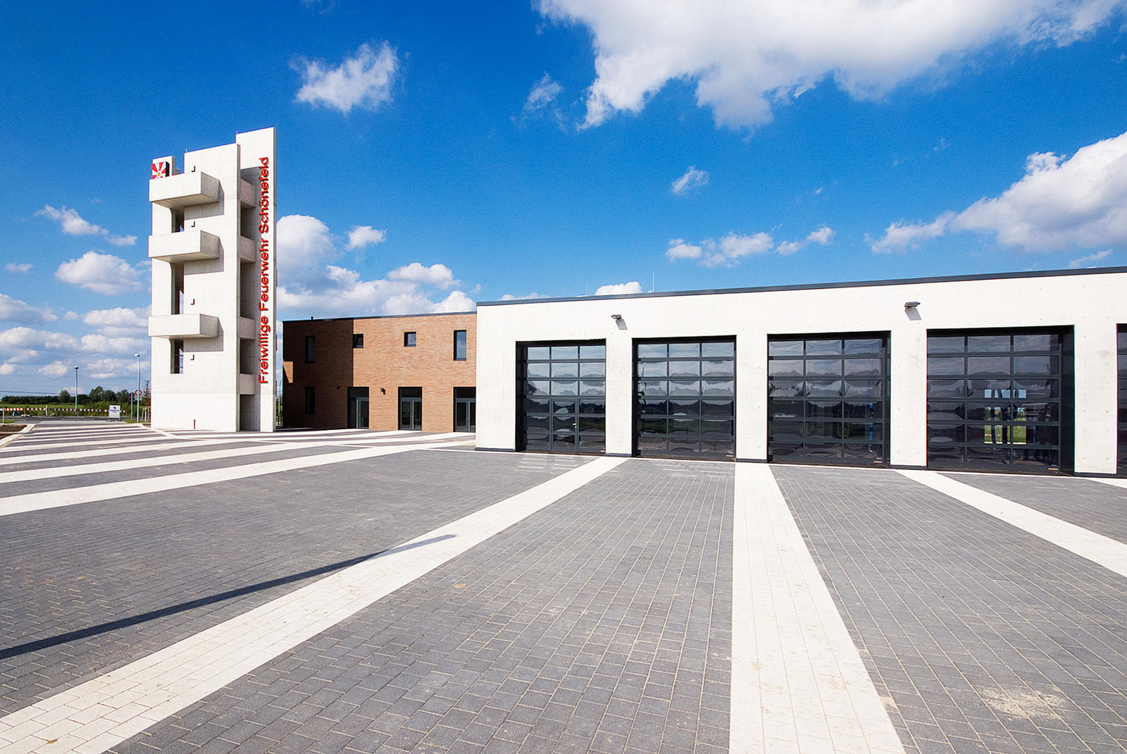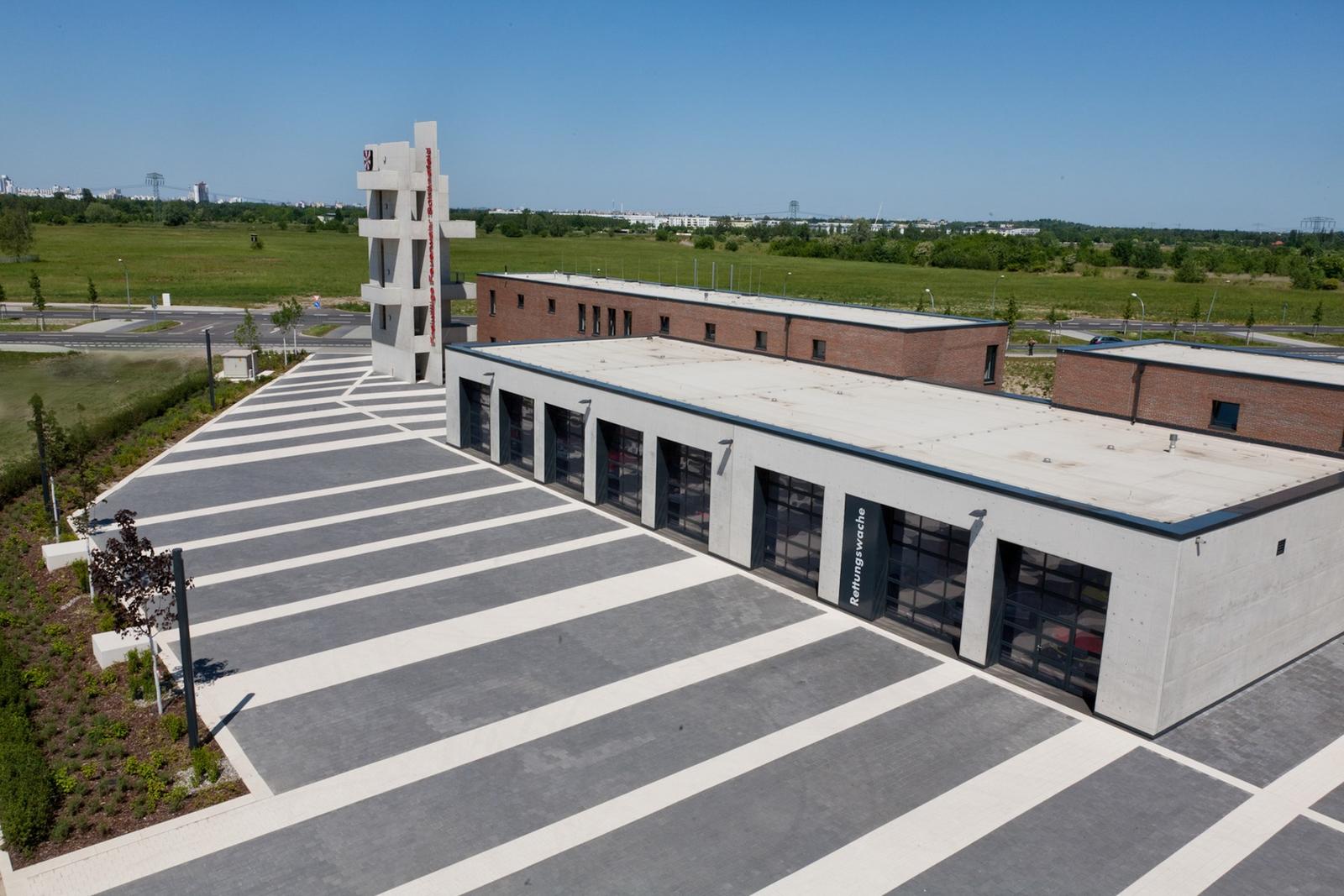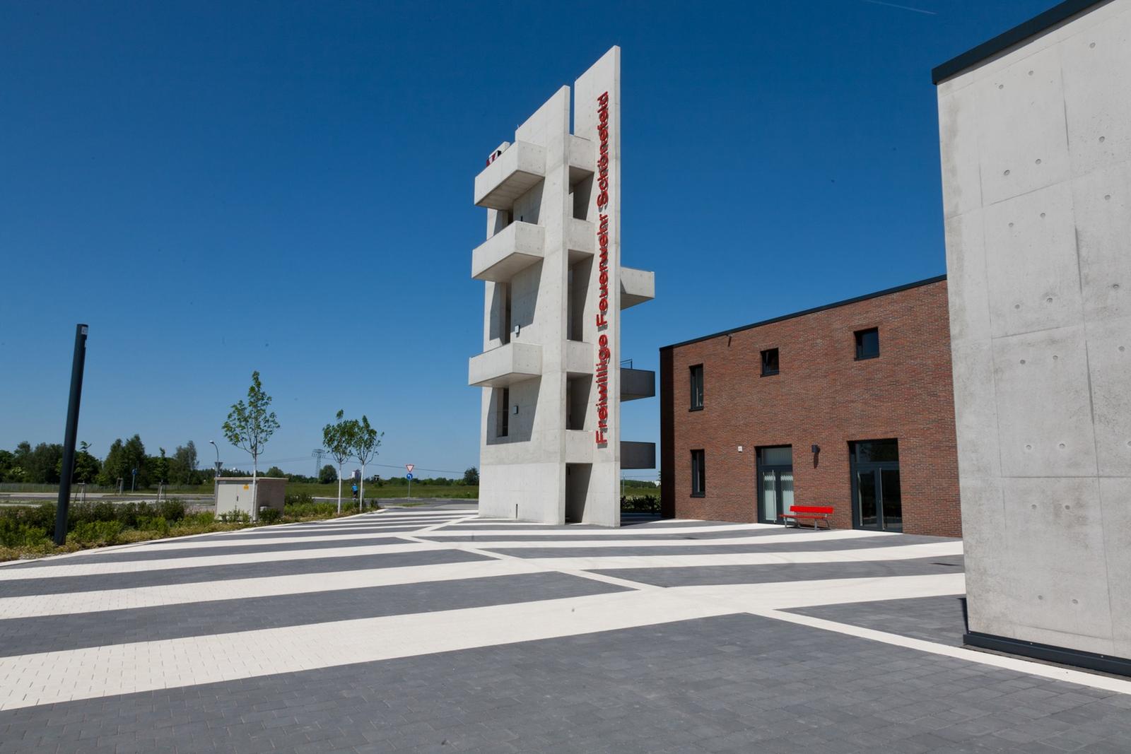 The open space design of the Fire Brigade in Schönefeld is defined by the function of a fast and secure practicability of the surfaces in case of need. They build a spatial unit infront of the exit gates for the fire trucks. Paving in dark grey and bright white stone tiles, diagonally laid over the traffic area, traces “beams” which start at the buildings, underligne the division of exit gates and run from there towards the outer surroundings. The overall open space has the effect of a signal, sending –with the tower at the peak of built form –, the message “attention”