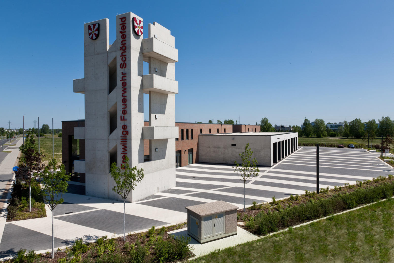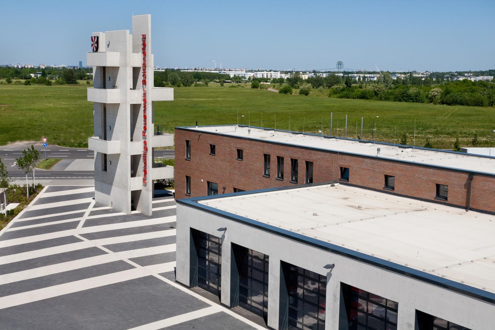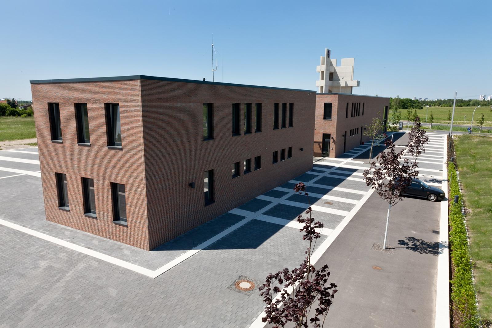The open space design of the Fire Brigade in Schönefeld is defined by the function of a fast and secure practicability of the surfaces in case of need. They build a spatial unit infront of the exit gates for the fire trucks. Paving in dark grey and bright white stone tiles, diagonally laid over the traffic area, traces “beams” which start at the buildings, underligne the division of exit gates and run from there towards the outer surroundings. The overall open space has the effect of a signal, sending –with the tower at the peak of built form –, the message “attention”