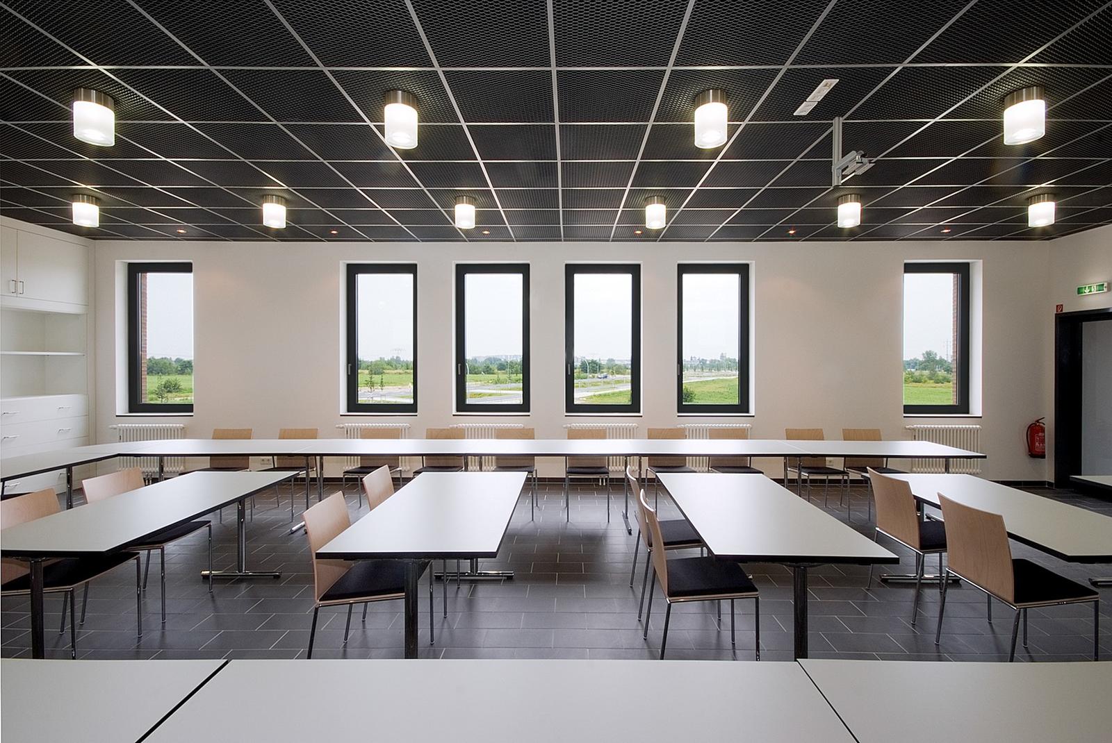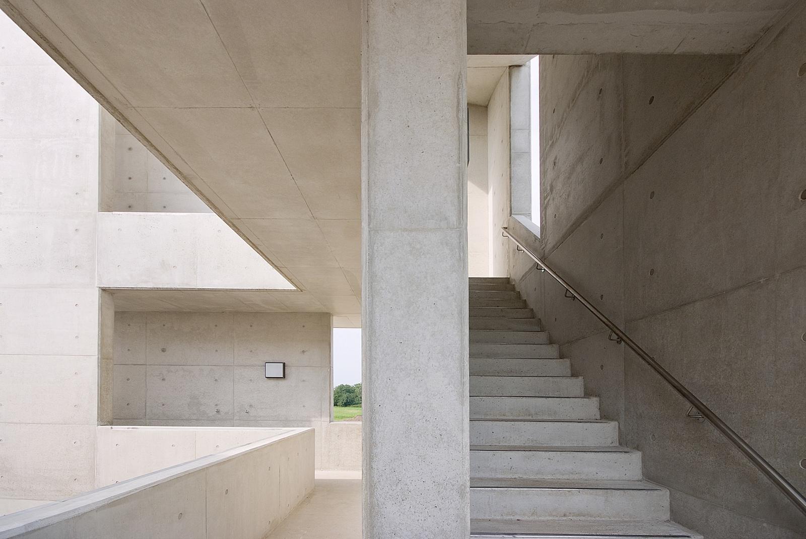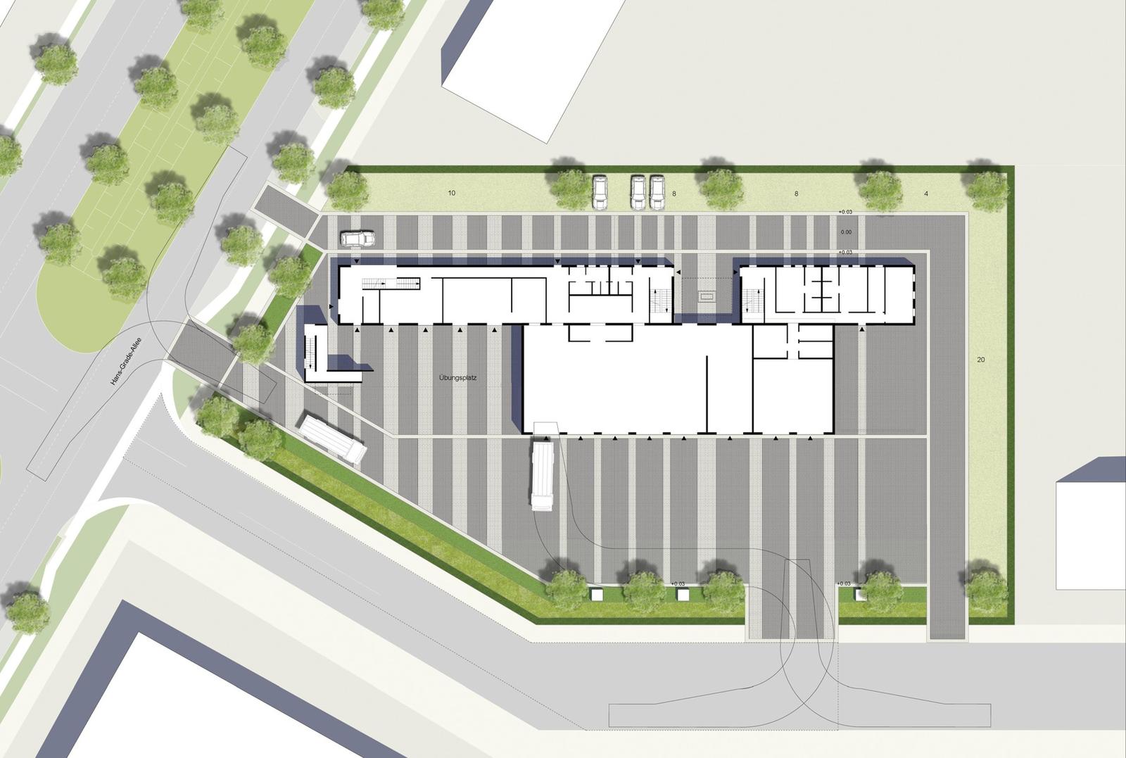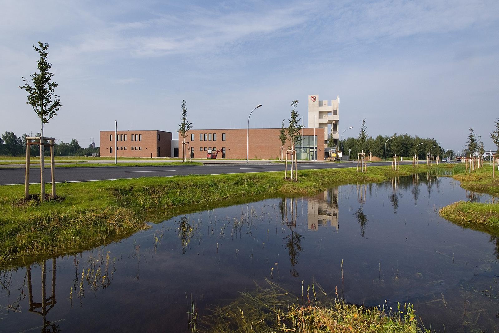 The open space design of the Fire Brigade in Schönefeld is defined by the function of a fast and secure practicability of the surfaces in case of need. They build a spatial unit infront of the exit gates for the fire trucks. Paving in dark grey and bright white stone tiles, diagonally laid over the traffic area, traces “beams” which start at the buildings, underligne the division of exit gates and run from there towards the outer surroundings. The overall open space has the effect of a signal, sending –with the tower at the peak of built form –, the message “attention”