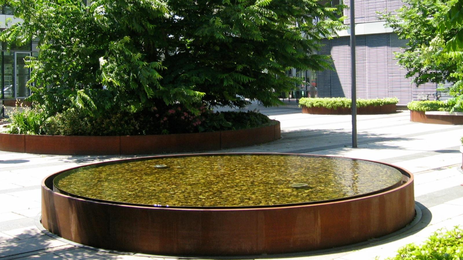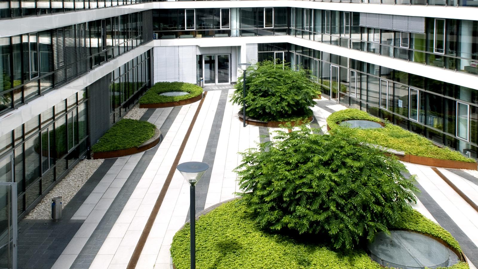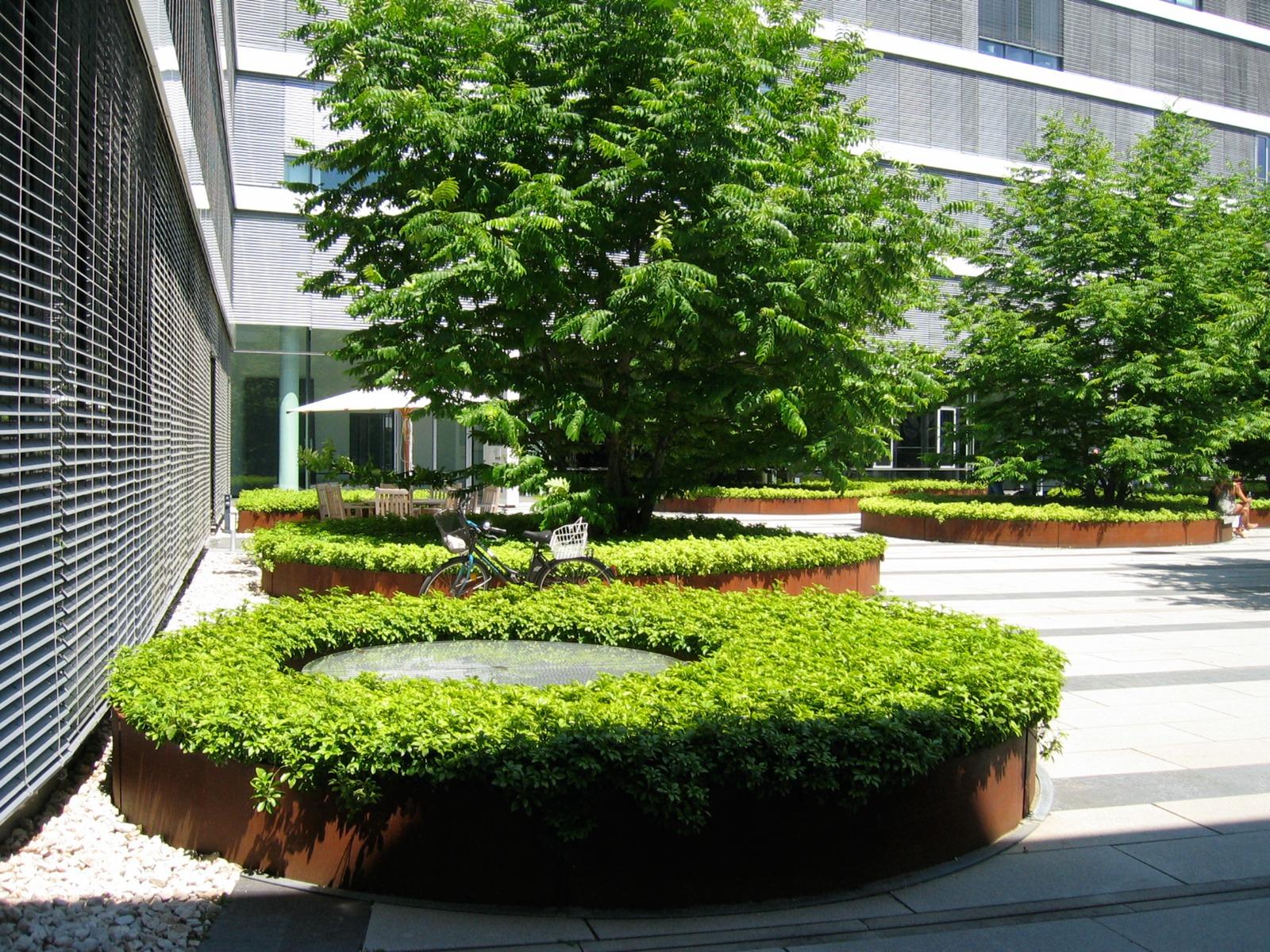 In the north of the Munich district Parkstadt Schwabing, Rainer Schmidt Landscape Architects + Urban Planners designed the exterior spaces on the private grounds of the Carrea office complex. The inner courtyard of the Carrea firm was to be made accessible for cars and had to be paved accordingly. Planted circles framed by Corten steel interrupt the “stone carpet” of the paving while accommodating seating and providing the experience of seasonal urban nature as an eye-catcher. Enclosed by the surrounding façades, the inner courtyard is marked by light colored, large sized concrete slabs and slimmer strips of dark slate. Round steel troughs with wingnuts are loosely dispersed over the outdoor area. Wingnuts are multi-stemmed trees with pinnate leaves, panicled blossoms and fruits and a shiny yellow hue in autumn, which produces an attractive, almost sculptural effect. The centre of the courtyard features a water basin. The russet color of the Corten gratings edged by the steel troughs form a harmonious complementary contrast with the subtleness of the ground covering pachysandra. The structure of the courtyard is extended by the same planted circles reappearing on the rooftop gardens. “Show landscapes” in the courtyard and on the roofs raise the experiential value and the quality of the location in an office landscape.