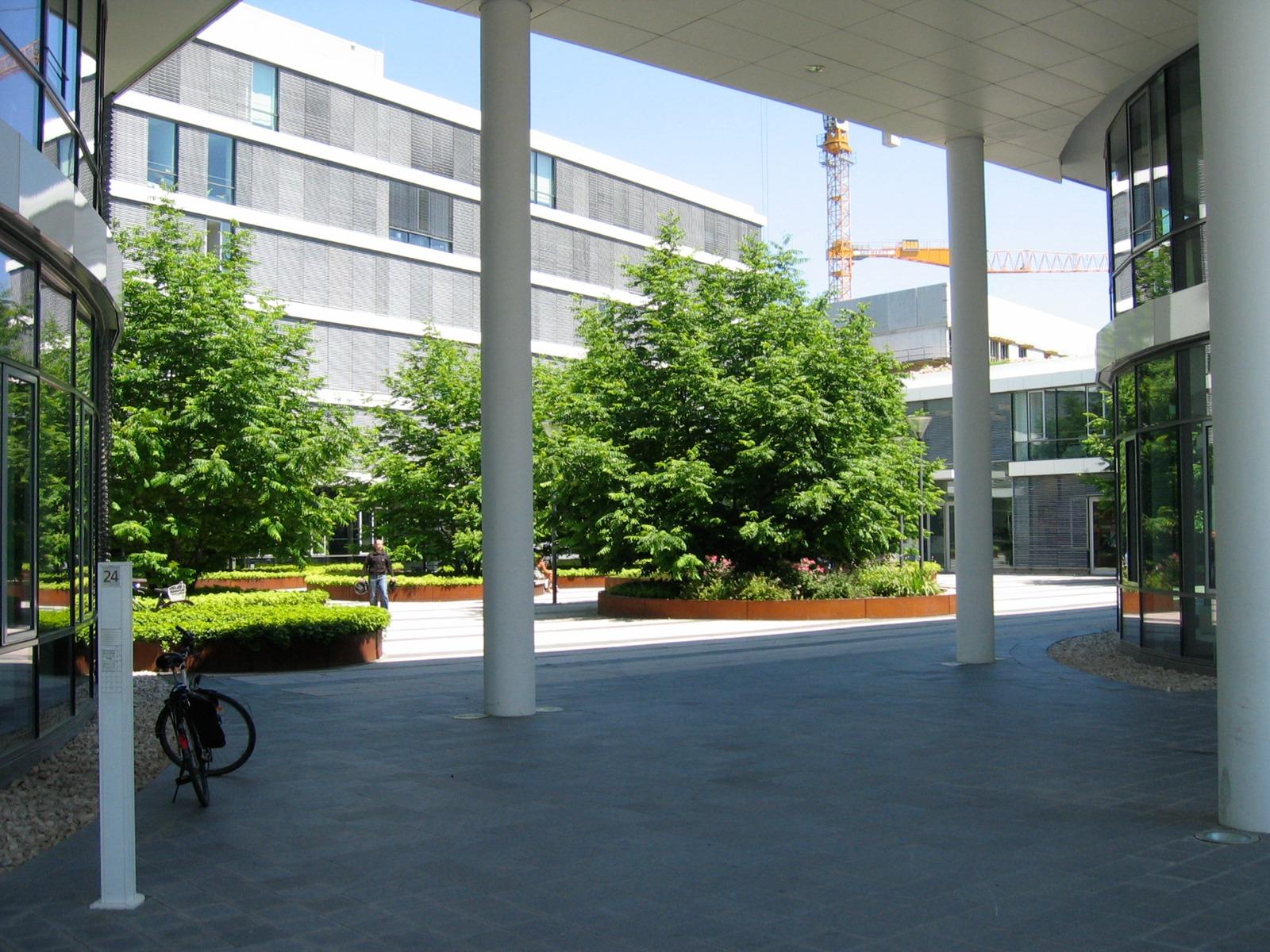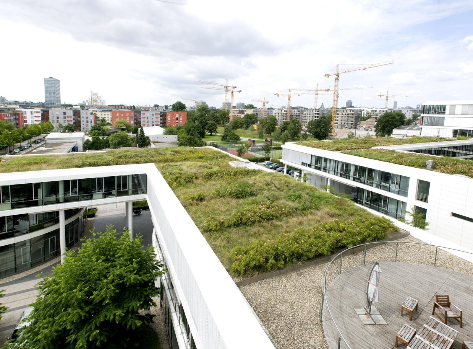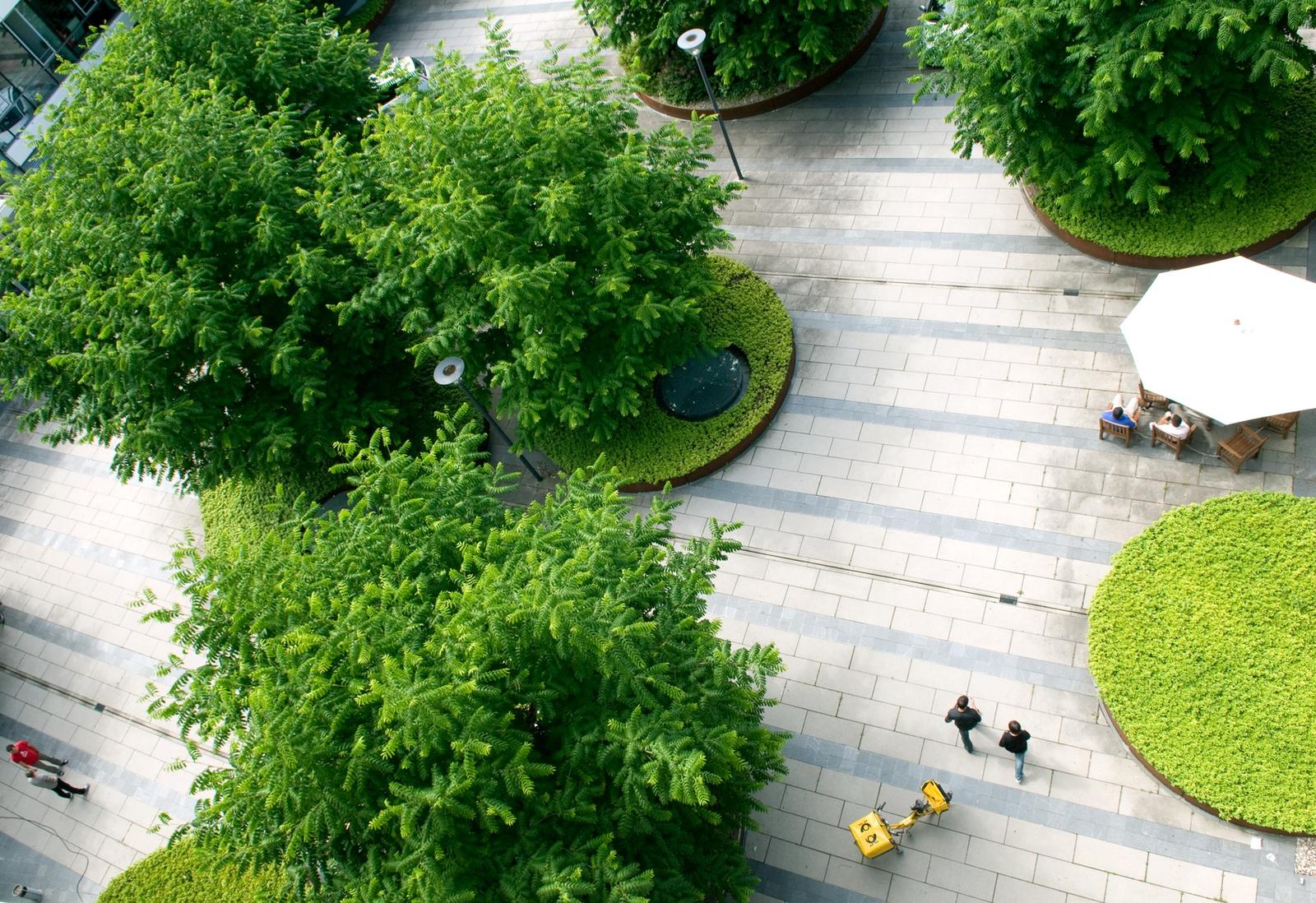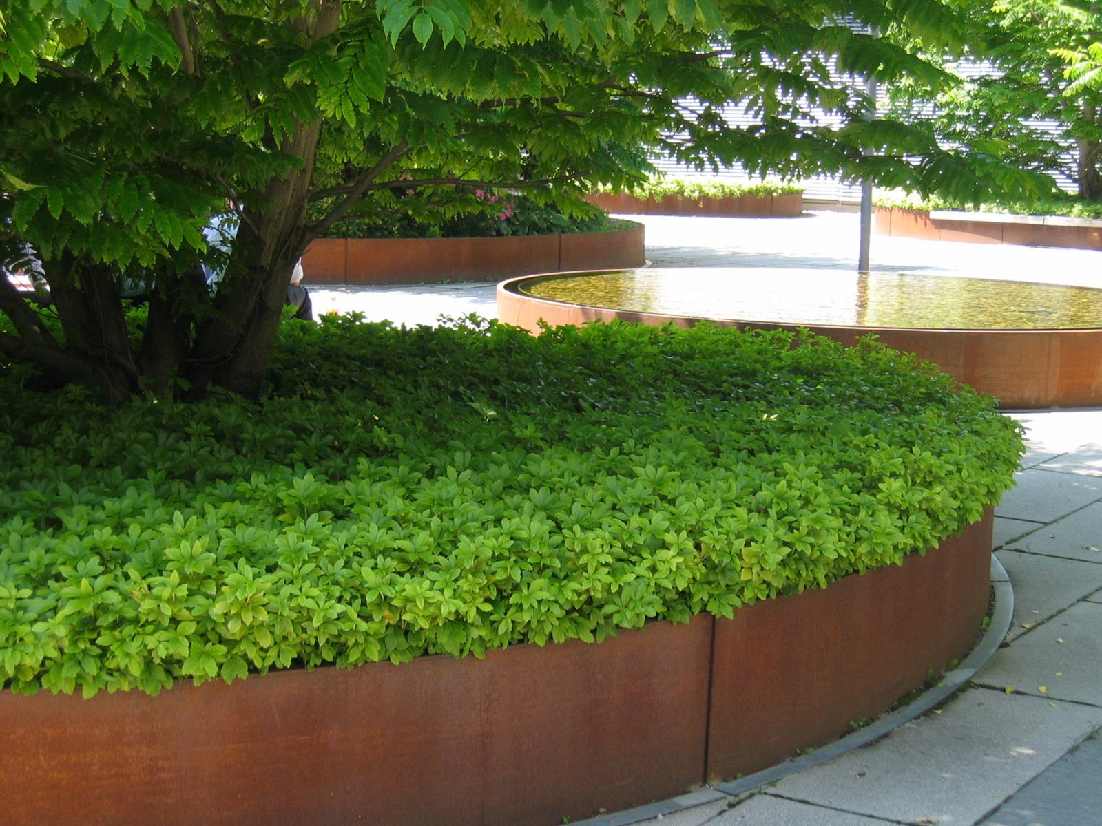 In the north of the Munich district Parkstadt Schwabing, Rainer Schmidt Landscape Architects + Urban Planners designed the exterior spaces on the private grounds of the Carrea office complex. The inner courtyard of the Carrea firm was to be made accessible for cars and had to be paved accordingly. Planted circles framed by Corten steel interrupt the “stone carpet” of the paving while accommodating seating and providing the experience of seasonal urban nature as an eye-catcher. Enclosed by the surrounding façades, the inner courtyard is marked by light colored, large sized concrete slabs and slimmer strips of dark slate. Round steel troughs with wingnuts are loosely dispersed over the outdoor area. Wingnuts are multi-stemmed trees with pinnate leaves, panicled blossoms and fruits and a shiny yellow hue in autumn, which produces an attractive, almost sculptural effect. The centre of the courtyard features a water basin. The russet color of the Corten gratings edged by the steel troughs form a harmonious complementary contrast with the subtleness of the ground covering pachysandra. The structure of the courtyard is extended by the same planted circles reappearing on the rooftop gardens. “Show landscapes” in the courtyard and on the roofs raise the experiential value and the quality of the location in an office landscape.