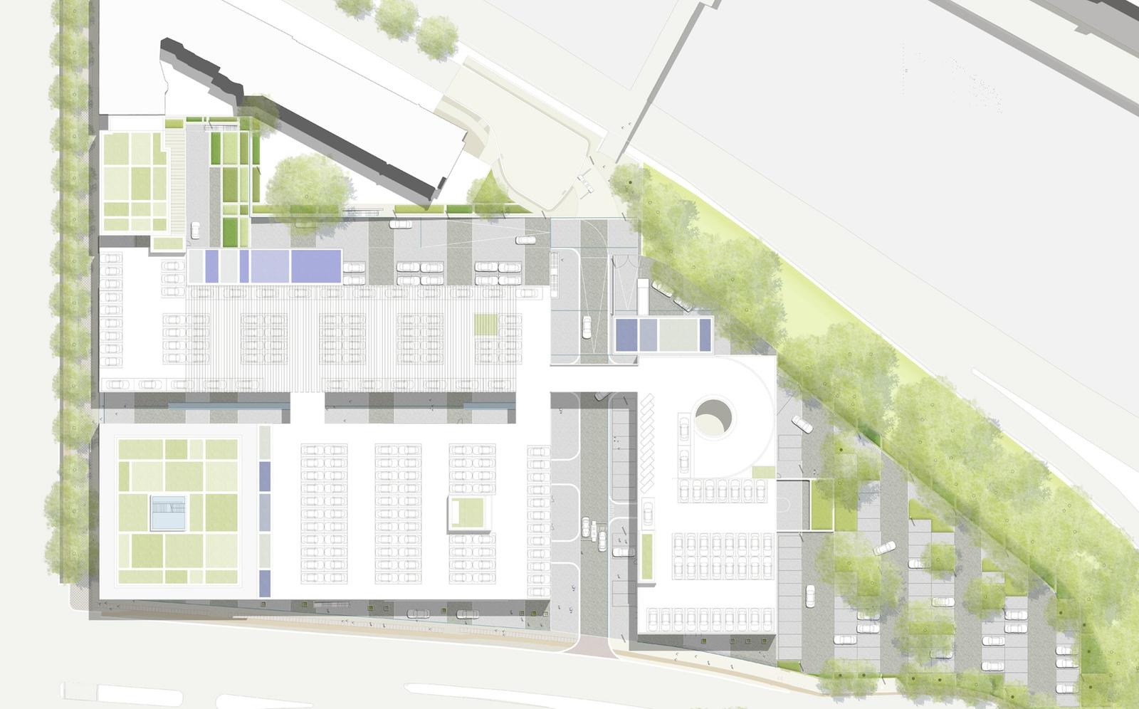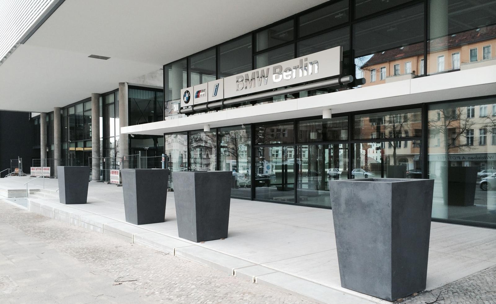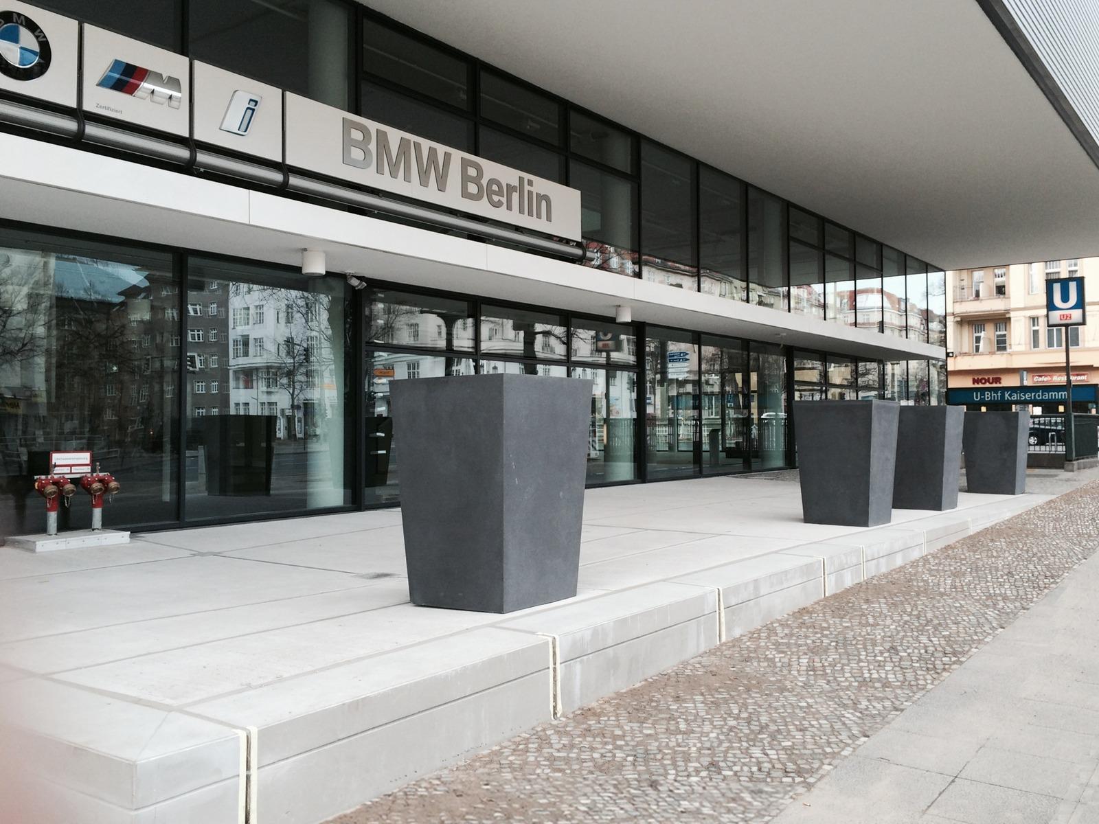 The new BMW branch in Berlin at Kaiserdamm is – as industrial use – architecturally in a subtle way integrated into the urban context. The open space design concept serves for binding the built form with its parts and sections almost completely by a broad-striped-pattern of surface design, connecting to the car-parking area in the front and thus making it perceivable for employees and visitors as a unit of use within the city. Large-centryn trees flank the three sides of the site differently; the car-parking area gains value from tree-planting as well.