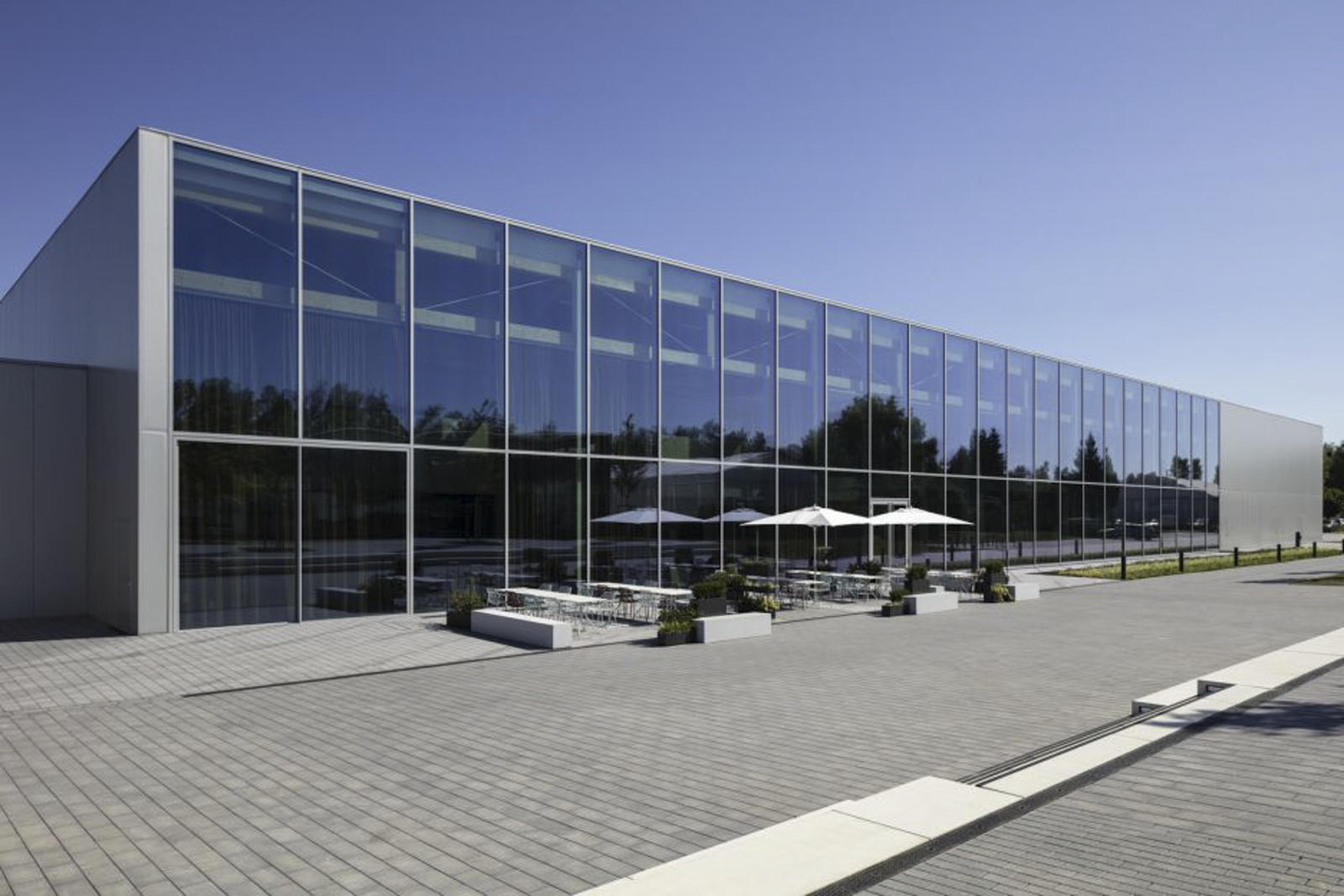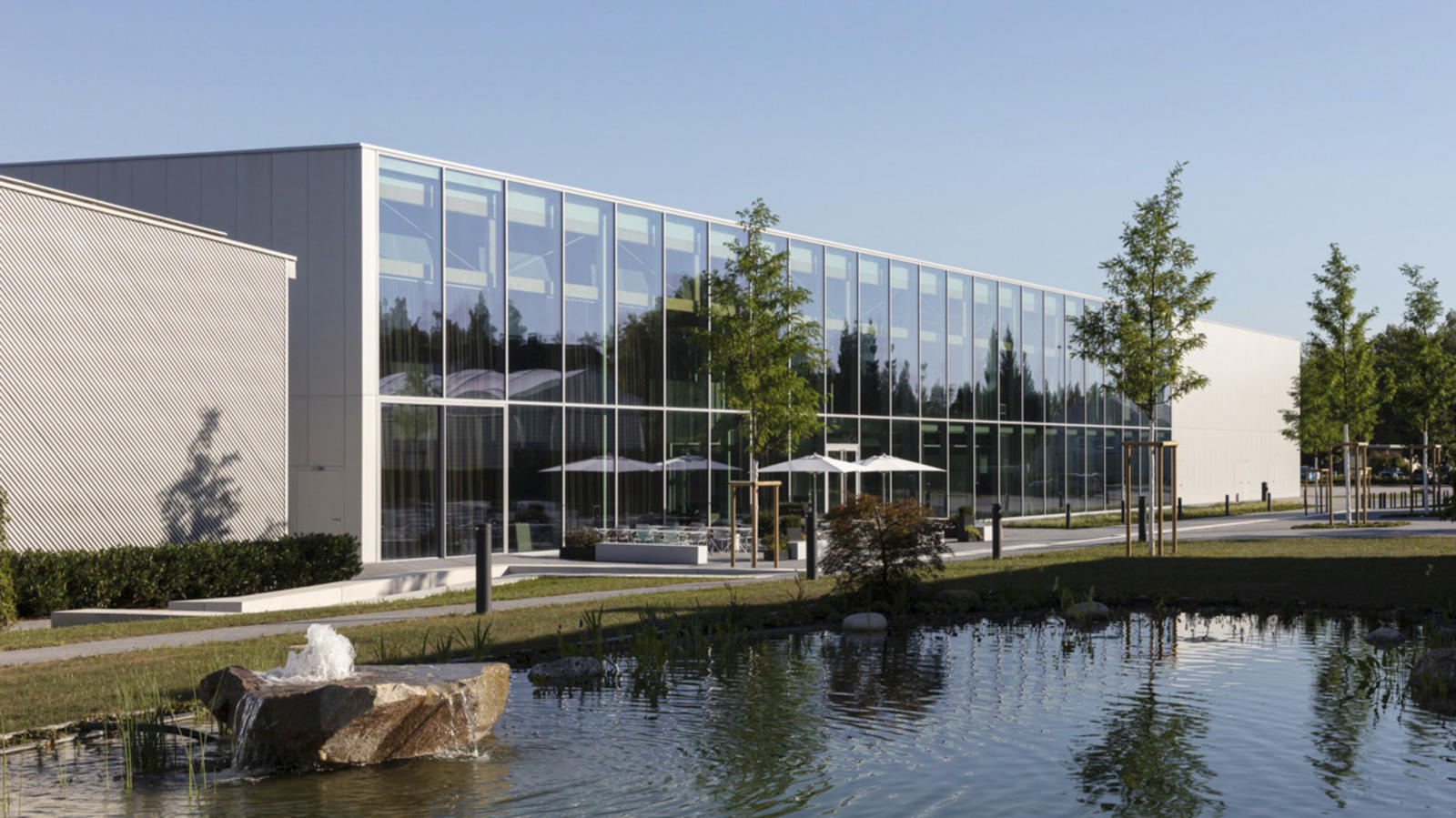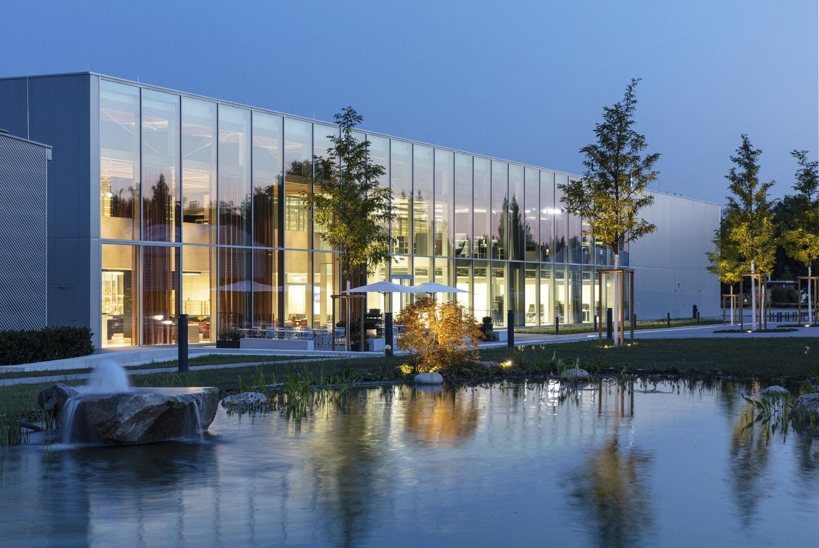 The new hybrid building is directly connected to the existing building. A entry of trees along the southwestern property line shields the building from Im Salmenkopf street. This is supplemented by new plantings to create a cohesive picture. The delivery takes place in the southeast via an in-situ concrete surface on which the semi-trailers can turn in order to then backwards to reach the inclined building delivery ramp. Walls secure the height differences here. The delivery area is drained via drainage channels. The access to the building entrances, the other buildings located on the property and other entrances is realized by means of paved surfaces made of composite paving. Along a strip of grass of the building divides the space. A small tree grove in connection with a staircase and seating area forms the center of the building ensemble and provides shade for comfortable sitting and ensures the necessary height compensation. Exposed concrete walls complement these sensibly along the edge of the square. Goods can also be delivered to the existing buildings via a ramp. On the northwest side, 19 parking spaces made of grass paving stones are planned along the processing boundary, as well as 30 bicycle parking spaces.