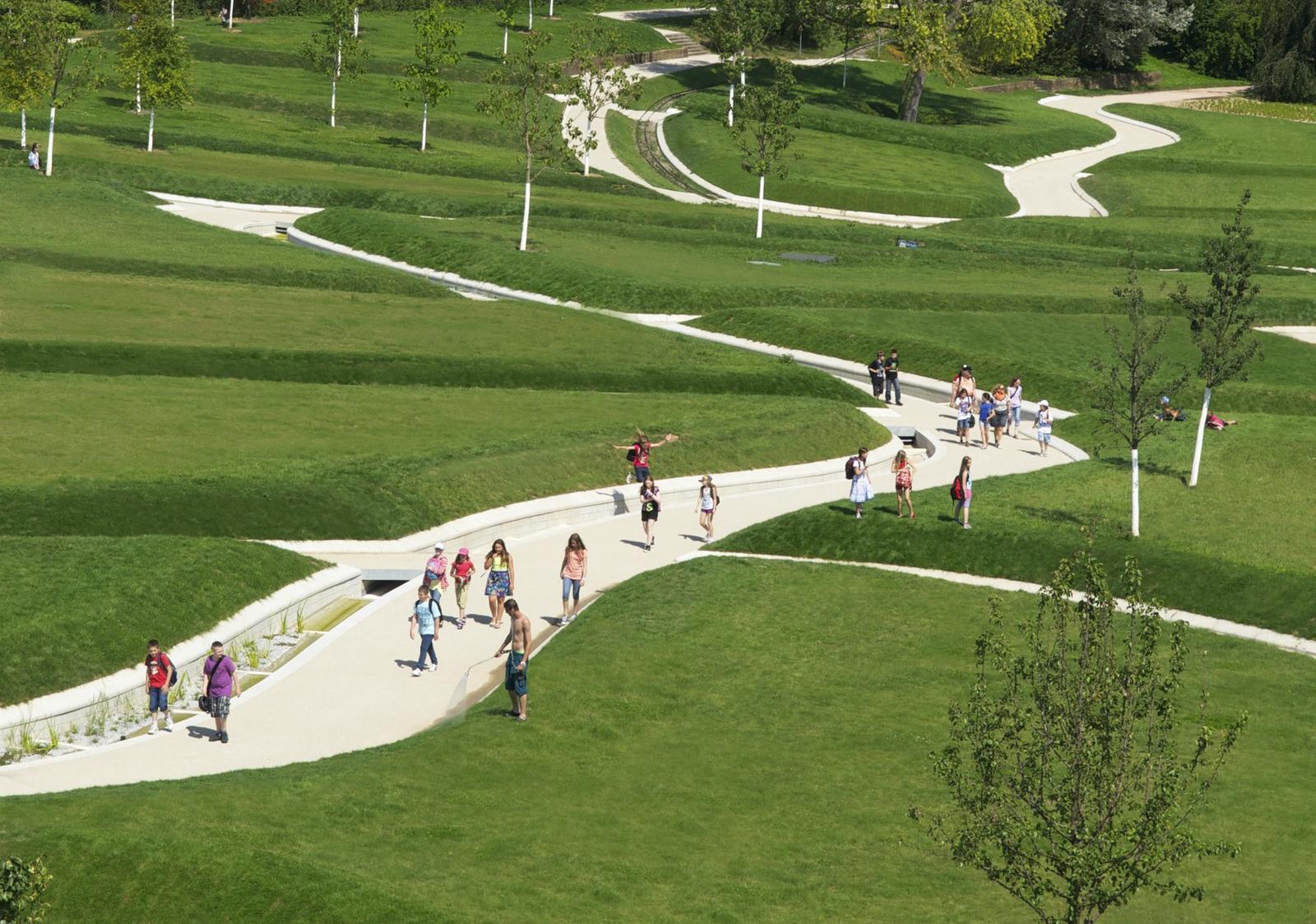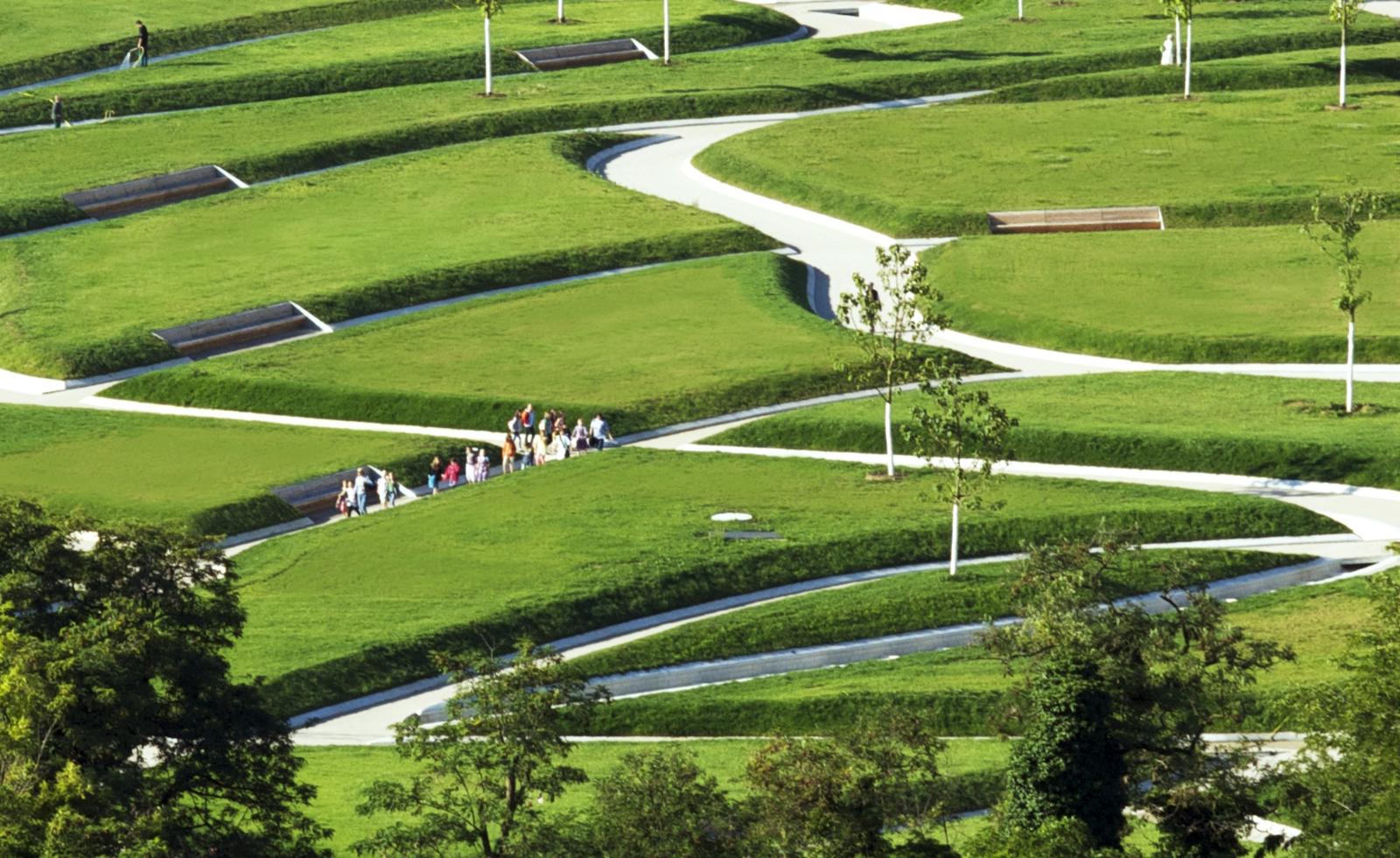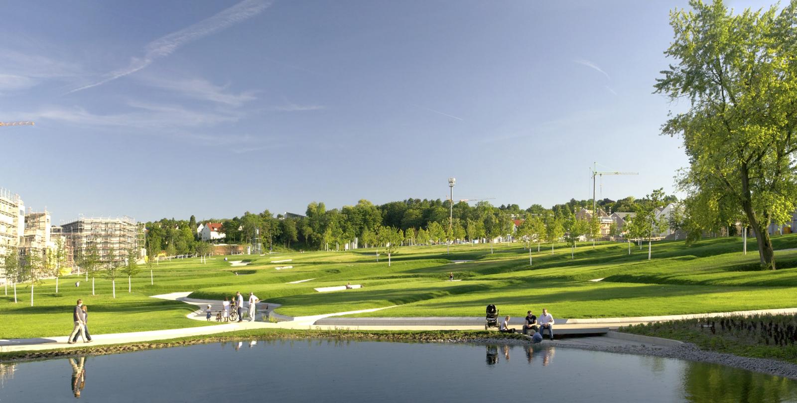 The history of the height park Killesberg has its origin in the industrial use of the areal as a quarry. The park represents one of the most important and largest parks of the city of Stuttgart. The task is an open process with the premise, to create a forward-showing concept for the extension of the park Killesberg, combining ecology with economy and preparing for a new urban living environment. The design concept is to be understood as the inheritance of two themes, defining the Killesberg: the man-made quarries as hard topographies and the soft, close to nature landscape. The moving topography, made of grass-pillows and sunken paths, provide for a variety of different perspectives while walking through and mark additionally a coherent identity for bridging towards the height park Killesberg and towards the new areas of built form. The grass pillows of the park generate living environments for a variety of flora and fauna by their micro-climate conditions.