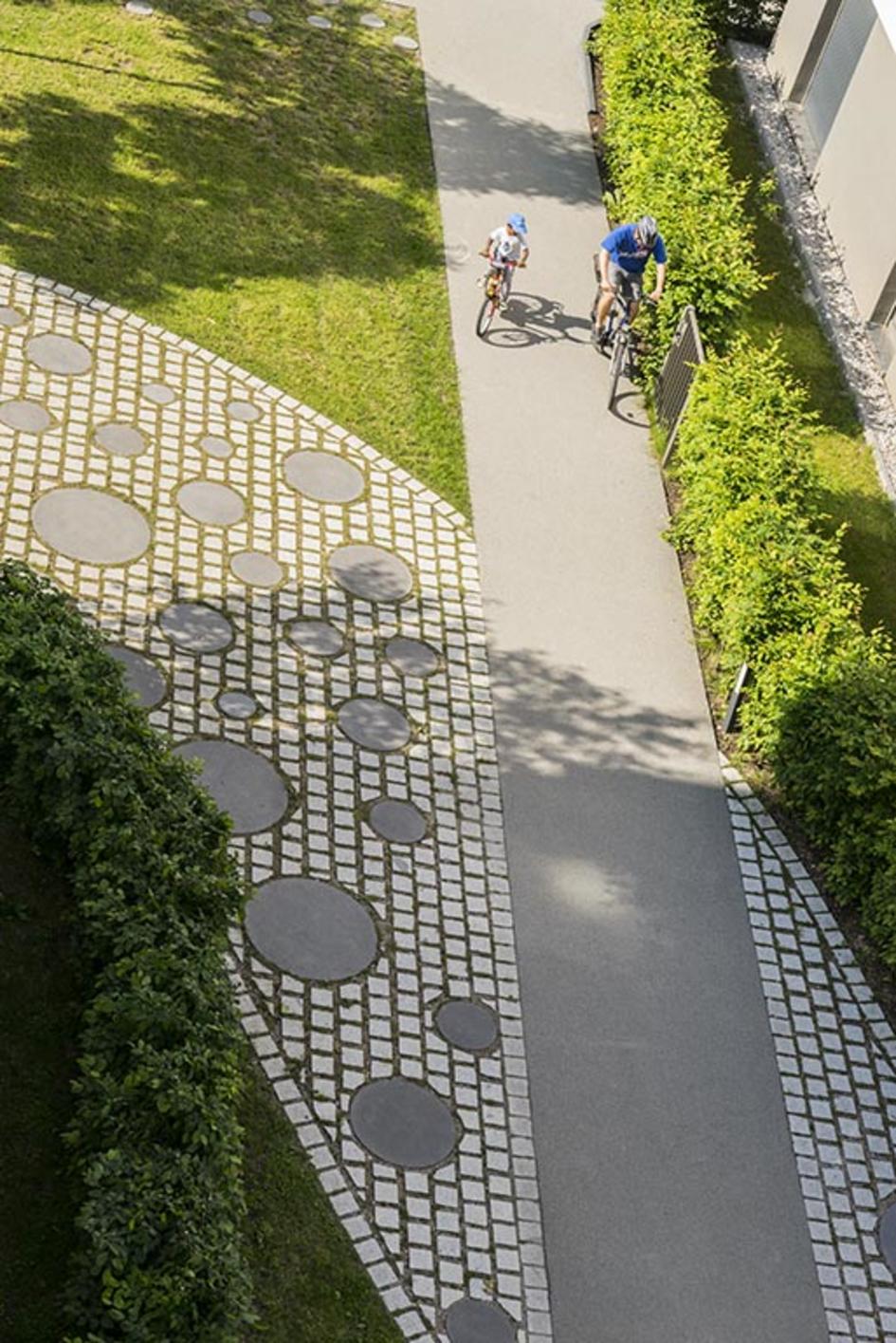 Diese Wohnbebauung in lockerer Gruppierung einzelner mehrgeschossiger Gebäude wird stadträumlich gefasst durch die Gestaltung der Freiräume. Die Gebäude haben im Erdgeschoß private Gärten. Diese sind durch Hecken gesäumt. Gemeinschaftlich nutzbare Rasenflächen unter Laubbäumen schaffen vielfältige Angebote für Aufenthalt und Kinderspiel. Die begrünten Flächen sind offen im Übergang zu umgebenden, teilversiegelten inneren Erschließungen (Bänder aus kleineren rechtwinkeligen und größeren kreisförmigen Kunststeinplatten). Die Auflockerung dieser Flächen durch die Muster der Pflasterung und durch die geschwungene Führung der teilversiegelten Flächen bindet das gesamte Quartier zusammen und schafft eine gute Erkennbarkeit der Adresse. Auch entsteht durch die Pflaster-Muster optisch eine Verengung der inneren Erschließungen, die z.T. für Feuerwehrzufahrten und Notverkehre dienen. Die Heckenpflanzung greift das Motiv der Rundung des Kreises in der Pflasterung auf und rahmt die Gebäude sowie die gemeinschaftlichen Freiräume mit sanftem Schwung an Wegekreuzungen. Insgesamt ist eine lebendige Atmosphäre der Hofnutzung um Spielflächen und wetterfeste Sitzgruppen herum auf den vielfach nutzbaren Freiflächen entstanden.