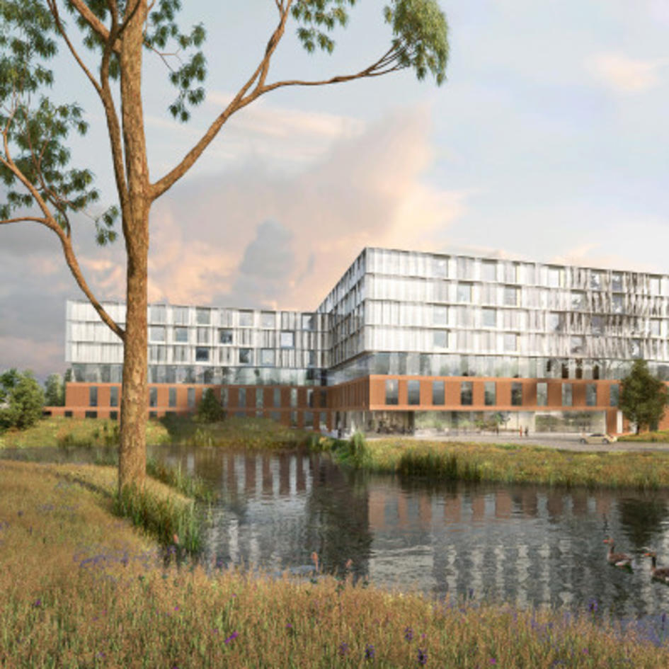 Das Konzept setzt einen neuen raumbildenden Akzent für Bodenrnutzung, öffentliche Wege- und Blickbeziehungen, Urbanität und Öffentlichkeit im Stadtkontext um einen bestehenden See herum. Auf dem Gelände befinden sich insgesamt mehrere, einander ergänzende und miteinander verbundene VVasserrückhaltebecken, die zum einen das anfallende Regenwasser auffangen und speichern und zusätzlich die Entwicklung eines Ökosystems fordern. Die .Attraktion „See in Tieflage" hat den Vorteil der eindeutigen Abgrenzung der Klinik im Stadtgefüge als „Nutzungseinheit" und zugleich als öffentlicher „Ankerort". Die Ortsbildung mit räumlichen Angeboten für gemeinschaftliche und individuelle Nutzungen liegt innerhalb und außerhalb der Bebauung. Innerhalb der Innenhöfe werden durch saisonale Pflanzungen in Kombination mit Wegen und Holzplattformen Aufenthaltsräume geschaffen. Zwischen Bebauung und Freiraum und in Nähe der Seeufer entsteht vor allem infolge der geschützten Raumbildung um den Retentionsteich herum eine für Besucher höchst attraktive Ufer-Lage'. Diese unterschiedlichen Lagebedingungen werden insgesamt gerahmt und teilräumlich verstärkt durch die „äußeren'· Baumpflanzungen mit lockerer Gruppierung von Laubbäumen sowie durch Pflanzung von Baumgruppen in der Tallage. Hier entsteht der windgeschützte Außenraum, tauglich für Gastronomie. Die Seeufer werden durch umlaufende Wege zu einer höchst attraktiven „Bühne" für Spaziergang, Wahrnehmung der Jahreszeiten und Erholung im Gefüge des Stadtkontextes.