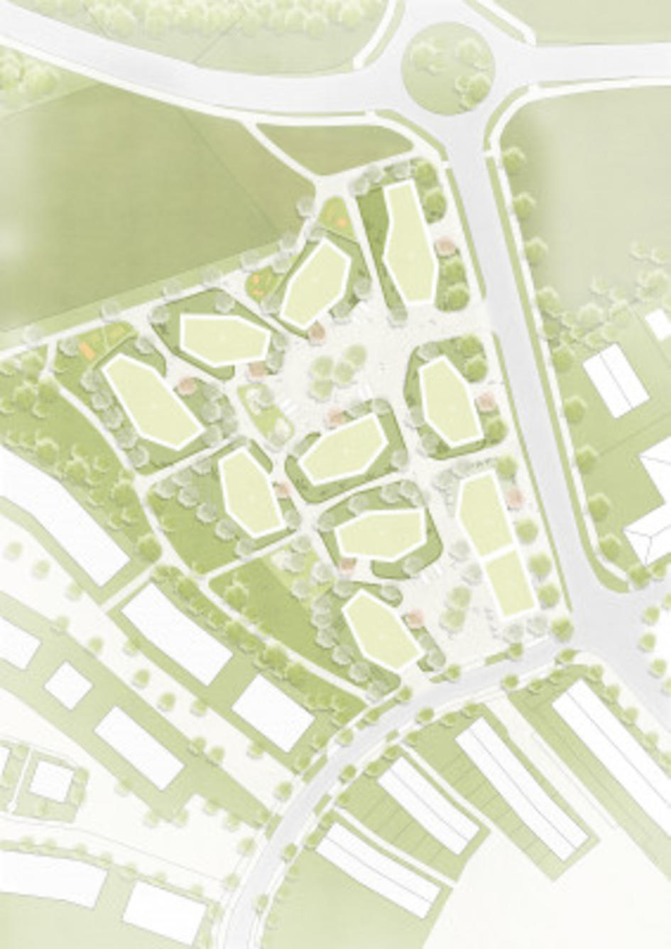 Die Konzeption von Bebauung und Freiräumen greift die Anordnung der bestehenden Bebauung auf. Die Bebauungseinheiten sind vorwiegend von Begrünung rundum umgeben und auf den Dächern durch extensive Begrünung angereichert, so dass sie wie „Grün-Inseln“ wirken und damit die Adressbildung für den Teilraum schaffen. Die Inselwirkung wird für Nutzung und Ökologie unterstützt durch die extensive Begrünung der Dächer. Das Konzept der Landschaftsarchitektur differenziert die Freiräume in der Erdgeschoßzone: