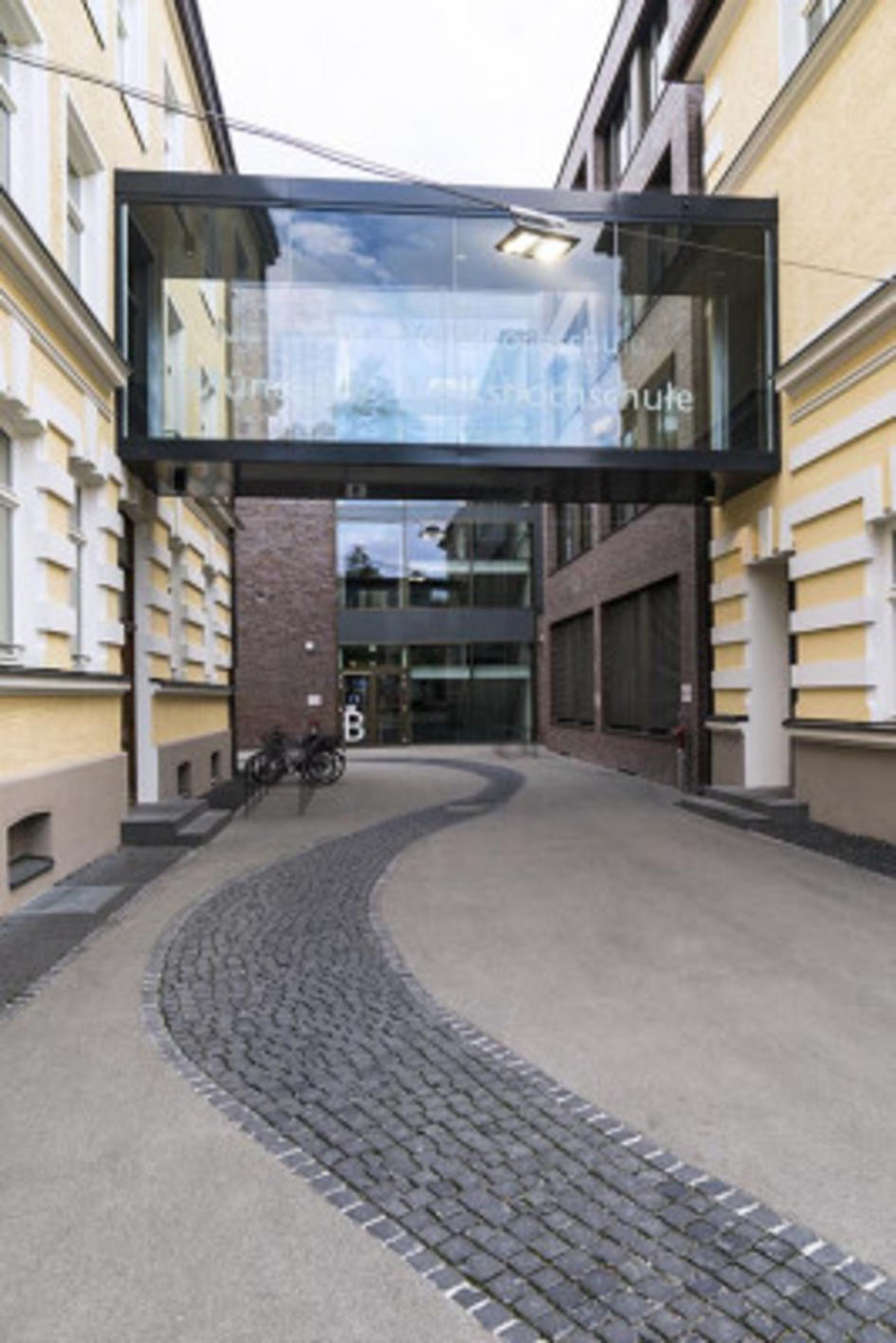 Die architektonische Einfügung der Schule Einsteinstrasse in den bestehenden Kontext von Quartier und Stadt bedeutete für die Konzeption der Freiräume ein hohes Maß an Sensibilität für den Ort und für die Erfüllung notwendiger Funktionen mit Respekt gegenüber dem Bestand der unmittelbar angrenzenden, bzw. seitlich vorgelagerten Bebauung. Es entstand im Ergebnis der Einfügung eine Aufwertung der gesamten Situation. Ein Vorgarten rahmt die Front der Neubebauung im Übergang zur Straße; die seitlich vorgelagerte bestehende Bebauung wird zum „Tor“ für den Fußgänger - Zugang von dort. Der so erschlossene Hofbereich wird als „rückwärtige“ Fläche vielfältig angereichert durch Pflasterung, durch Holzböden, durch Bäume und Möblierung für den Aufenthalt im Freien sowie durch Angebote für das Kinderspiel. Viele Nischen der möglichen Aneignung von Raum ergeben so insgesamt ein lebendiges Bild der Robustheit und der Nutzbarkeit der Freiräume. Darüber hinaus sind die verwendeten Materialien, Pflanzen und Farben eine Einladung für den Aufenthalt und für die Querung. Die Anreicherung dieser urbanen Flächen durch Vegetation findet auf den Dachflächen in Form von extensiver Begrünung ihre Fortsetzung.