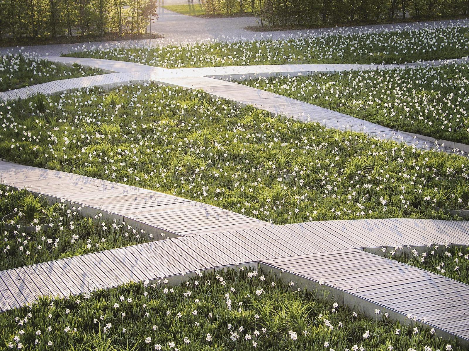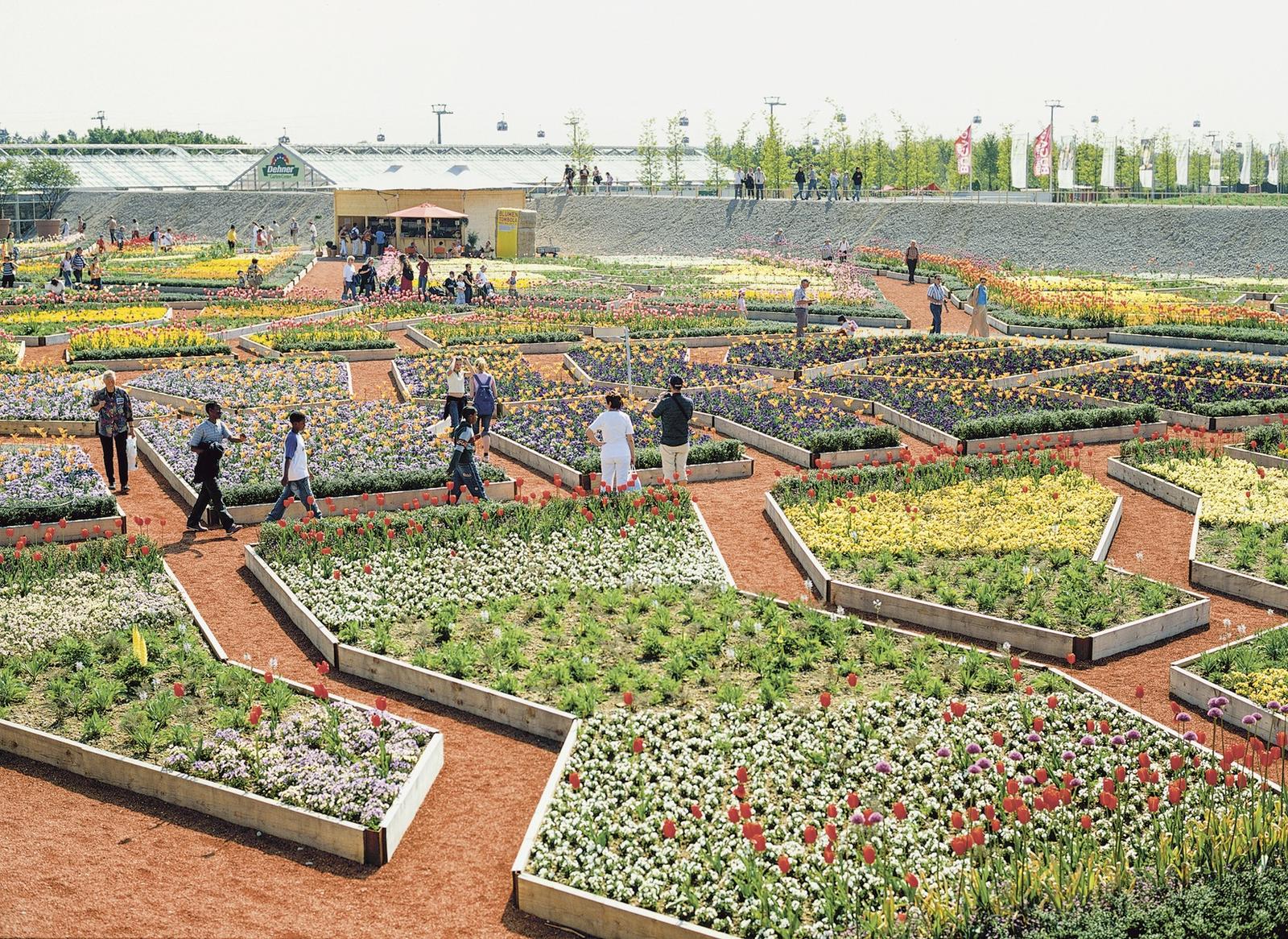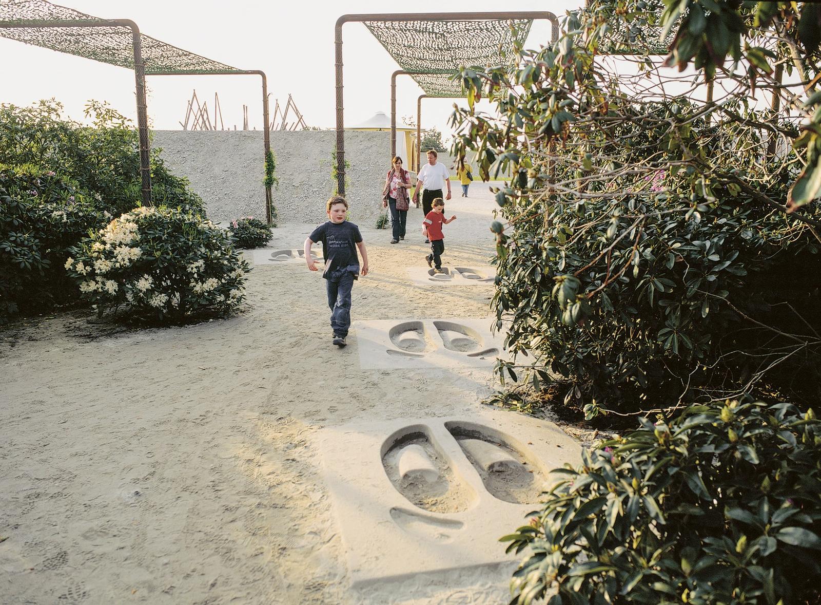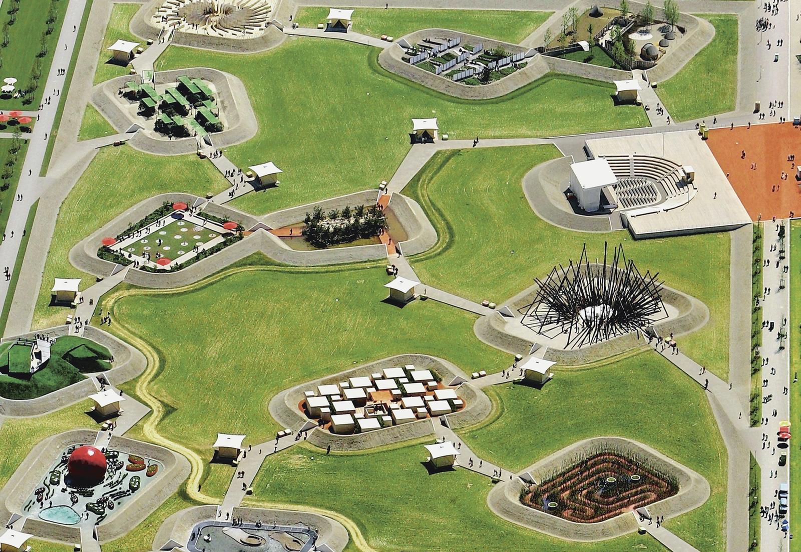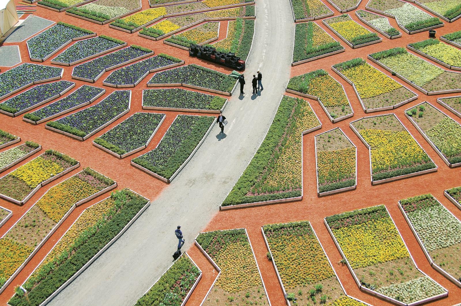 The organic, as the basic structural pattern of every herbal life, becomes the form-giving theme for the central exhibition areas. The setting into scene of changes of perspective, micro-macro, pervades the whole Garden-Show like a red thread of different expression. Within the gardens of potencies, the self-similarity of microscopic plant structures serves for new garden images. The parallel gardens are determined by few elements: Cut hedges, woody plants, and in East-West-direction running trails form elongated parallel spaces. Also in the leaf garden, the macro projection serves as a role model for structuring the exhibition area.