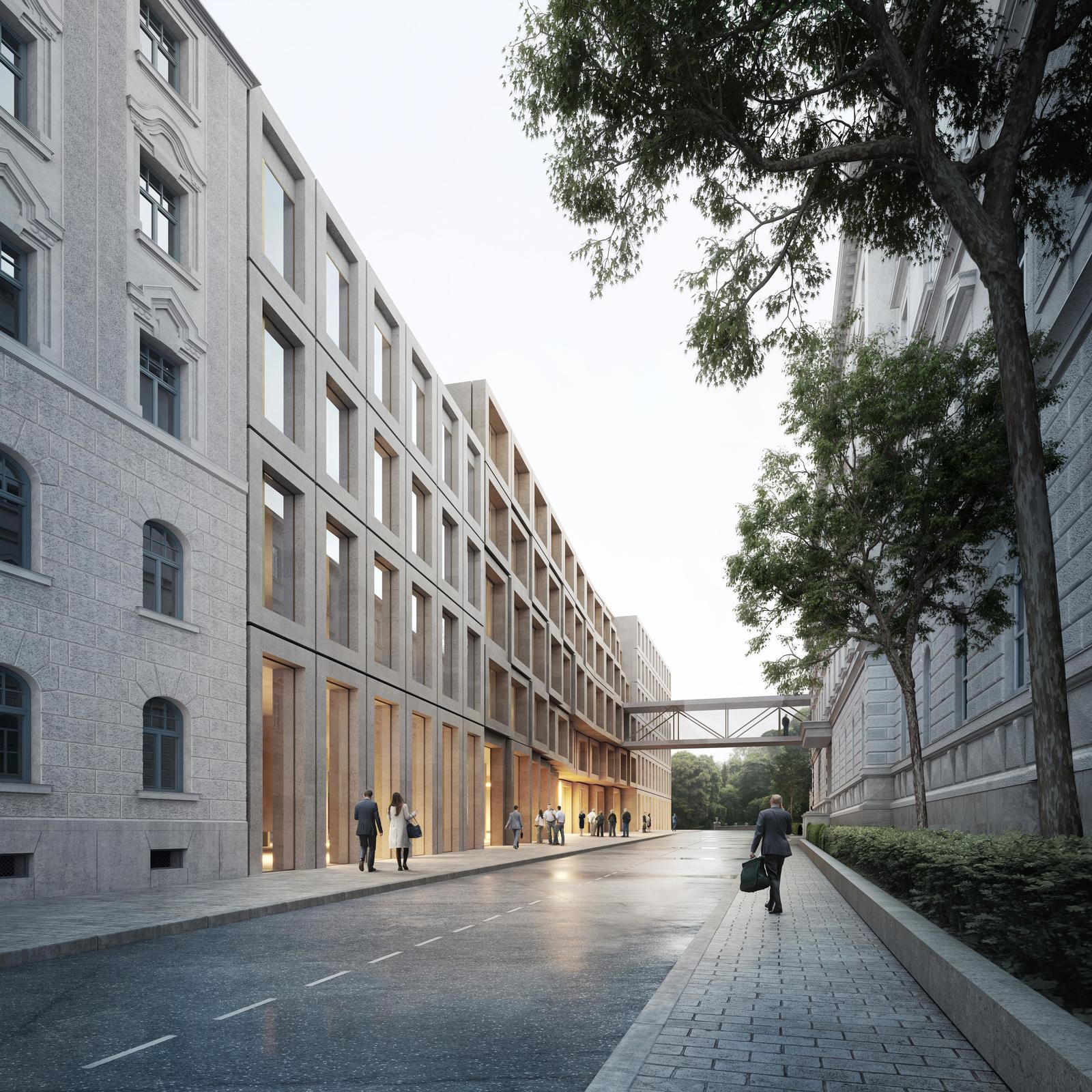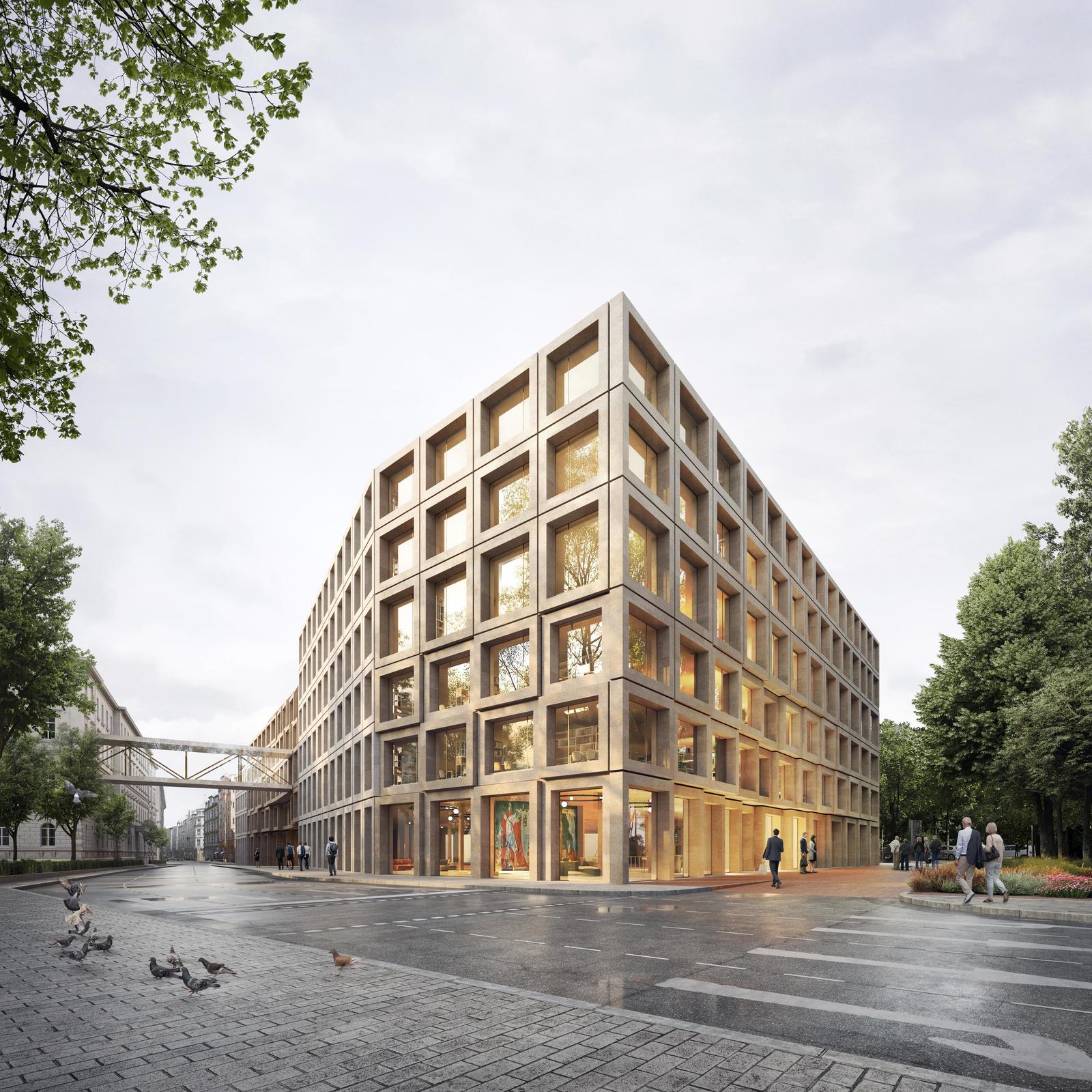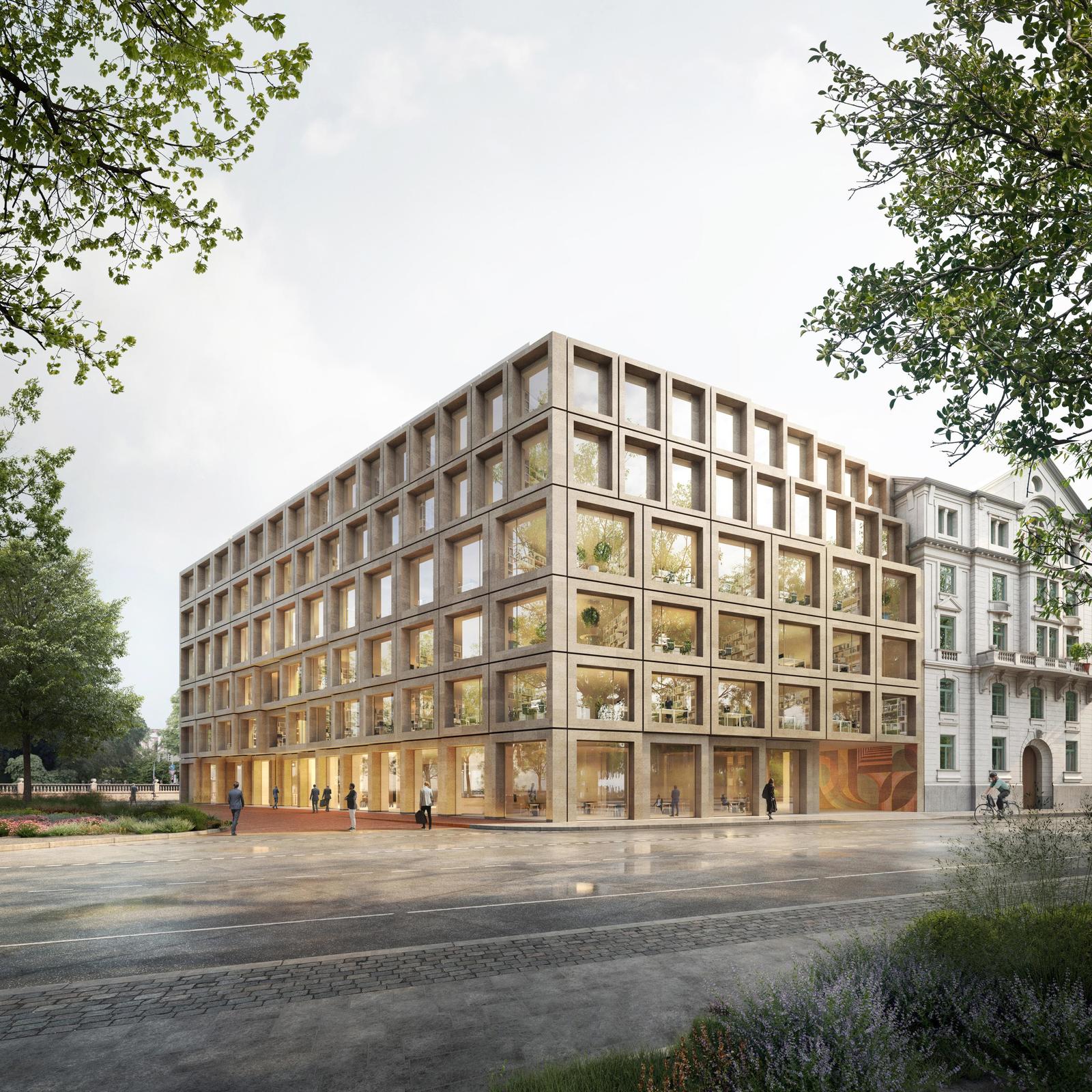 Ein wichtiger Aspekt der Maximilianstraße in München ist der denkmalgeschützte Bestand. Diesem begegnet unser Entwurf mit großem Respekt, vermittelt jedoch gleichzeitig ein zeitgemäßes und angemessenes Selbstbewusstsein. Er integriert sich als selbstverständlicher Teil in das Stadtgefüge. Die variierende Öffnung der Natursteinfassade gliedert den Baukörper über die Geschosse und entlang der Straßenfluchten. Dadurch erlangt er Übersichtlichkeit und wird als Baustein im Stadtraum verankert.