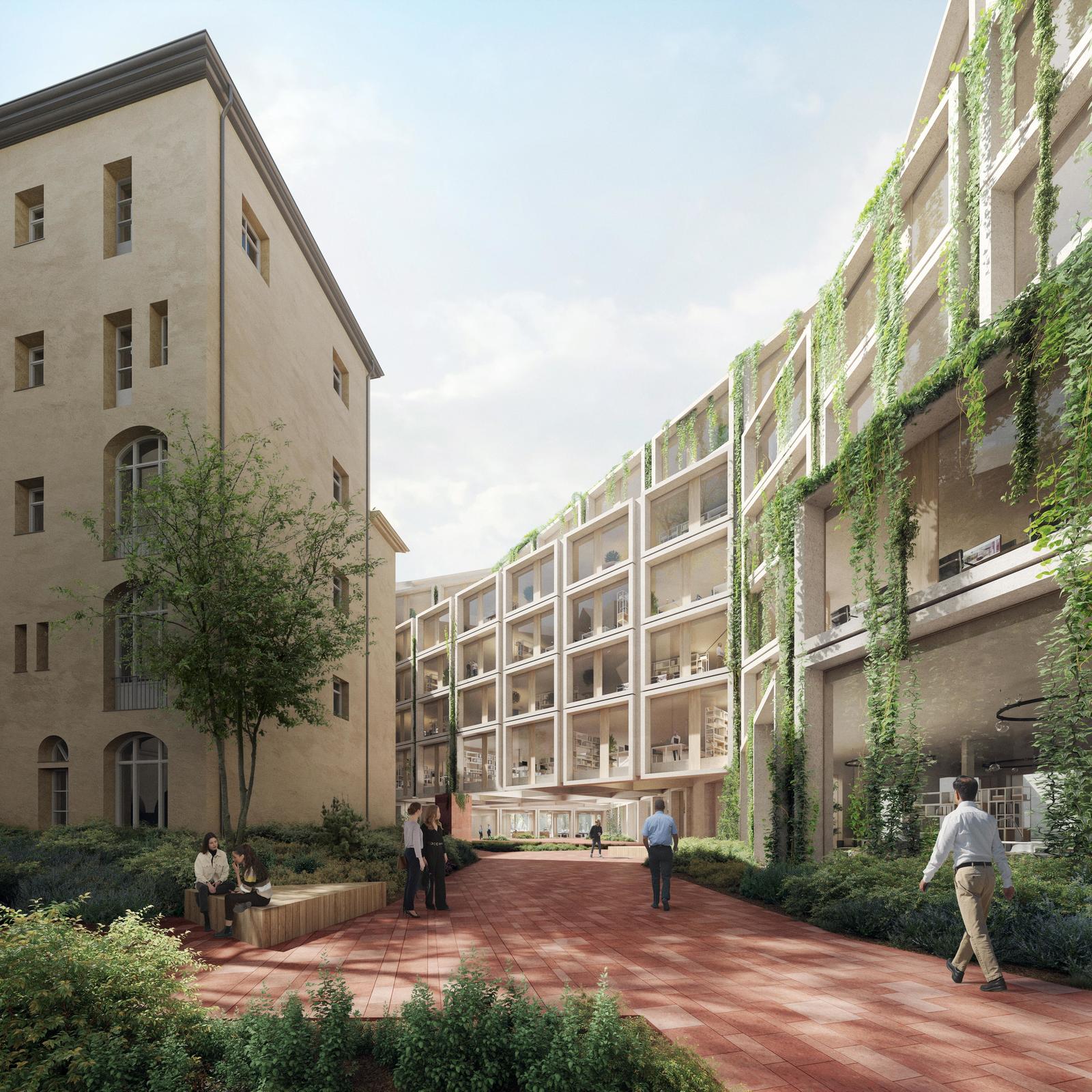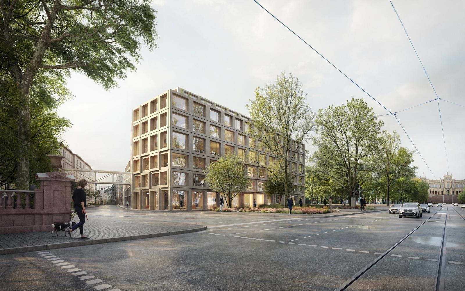 Im Innenhof verfolgt die Geometrie einen dynamischen Ansatz, der im Dialog mit den Nachbargebäuden eine eigene amorphe Figur bildet. Hier dominiert eine Leichtigkeit, die von umfangreicher Begrünung sowohl auf den Flächen als auch an der Fassade unterstützt wird. Es entsteht ein artifizieller, innerstädtischer Grünraum mit einer spezifischen Atmosphäre und hohen Aufenthaltsqualität nicht nur für Mitarbeiter der Büroflächen, sondern auch für Anwohner. Die ökologisch hochwertigen Grünflächen mit neu gepflanzten Bäumen bilden einen Ort der Ruhe mit verschiedenen Rückzugs- und Erholungsmöglichkeiten. Die Aufenthaltsflächen sind durch die klaren Wegeverbindungen zu den Gebäudefluchten und -eingängen leicht zugänglich. Ein Hindurchscheinen des grünen Innenhofs bis zur Maximilianstraße unterstützt dies und trägt zu einem einheitlich spannenden Bild des Entwurfs bei. So kann der „fließend“ angelegte Hof als ein Kontinuum wahrgenommen werden, dass sich durch den in Holz konstruierten „Brückenbraukörper“, bis zur Straße hin wirkt. Ein einheitlicher Belag gilt dabei als wesentliches Element der Identität und sich über Vorplatz, Foyer und Innenhof erstreckt und so verknüpfend wirkt.